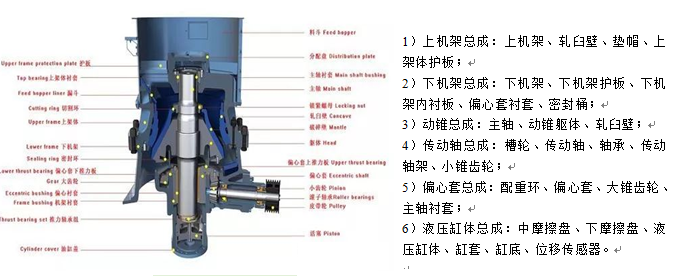 | 結(jié)構(gòu)組成 | 上機(jī)架,下機(jī)架,動(dòng)錐,傳動(dòng)軸,偏心套,液壓缸體 | 下機(jī)架,偏心套,傳動(dòng),支撐套,調(diào)整環(huán),動(dòng)錐 | 附圖一、圖二 |