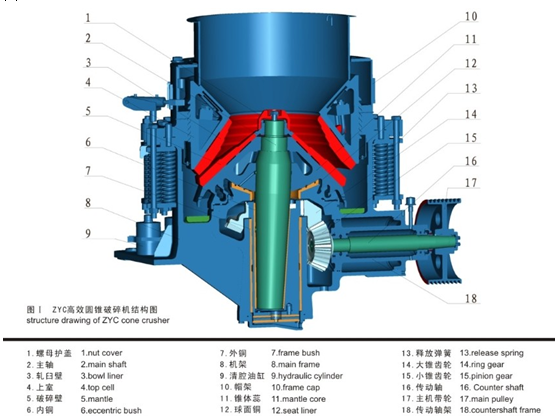 破碎腔:兩個(gè)破碎元件形成的空間內(nèi)部結(jié)構(gòu),是圓錐破碎機(jī)破碎物料的地方;