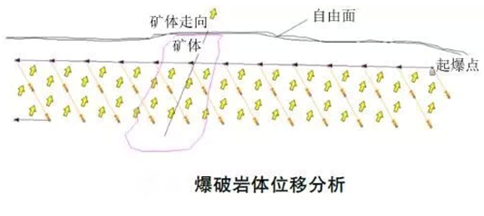 對于貴金屬礦山,礦石的損失、貧化控制非常重要。因此,在礦石區(qū)域為了控制巖體位置的移動,用軟件對臺階的分區(qū)布孔,使用高精度導爆管雷管或數(shù)碼電子雷管,逐孔起爆網(wǎng)路進行設計、模擬,精確控制起爆順序,使巖體移動方向與礦體走向一致(見圖),并通過測量炮孔爆破后的實際位移量指導礦石的挖掘,最大程度的避免礦石與廢石混雜,以減小采掘時礦石的損失、貧化。