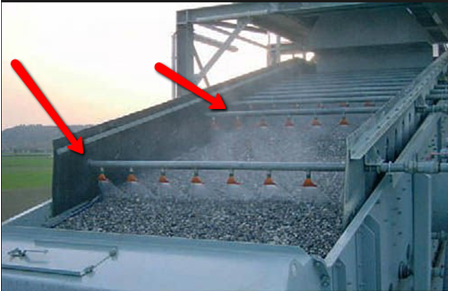 在產(chǎn)生粉塵的入料口、出料口和破碎腔這三個主要部位設置噴水裝置,每處各設置兩個噴水嘴。其中,入料口處兩個噴嘴指向入料口;出料口處兩個噴嘴相對形成一定角度,使噴出的霧水成交叉狀態(tài),達到最佳噴霧效果,振動篩上噴頭裝在頂層篩網(wǎng)上方。